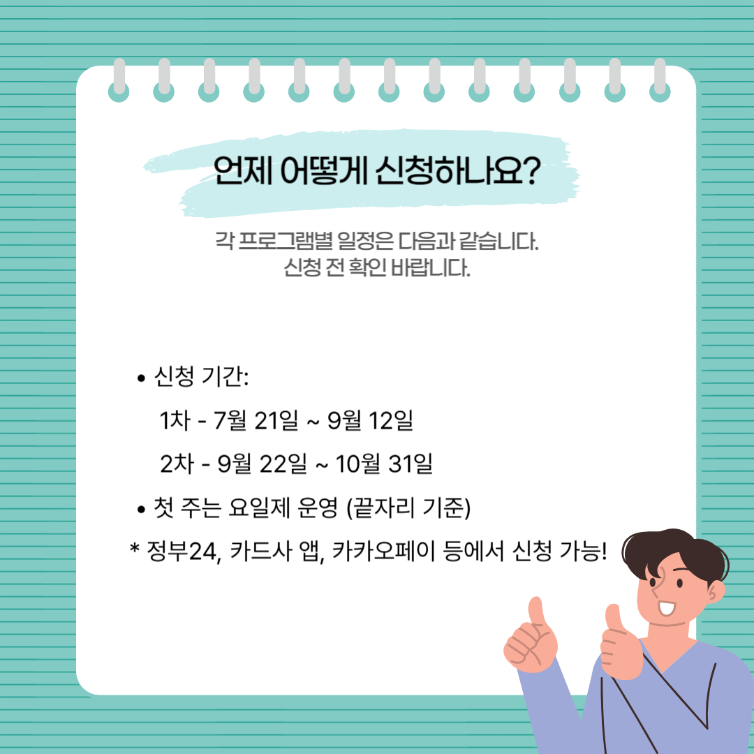 신청은 1차(7.21~9.12), 2차(9.22~10.31) 두 차례 진행된다. 특히 1차 시작 주에는 요일제가 적용되므로 끝자리 숫자를 확인하고 해당 요일에 신청해야 한다.
