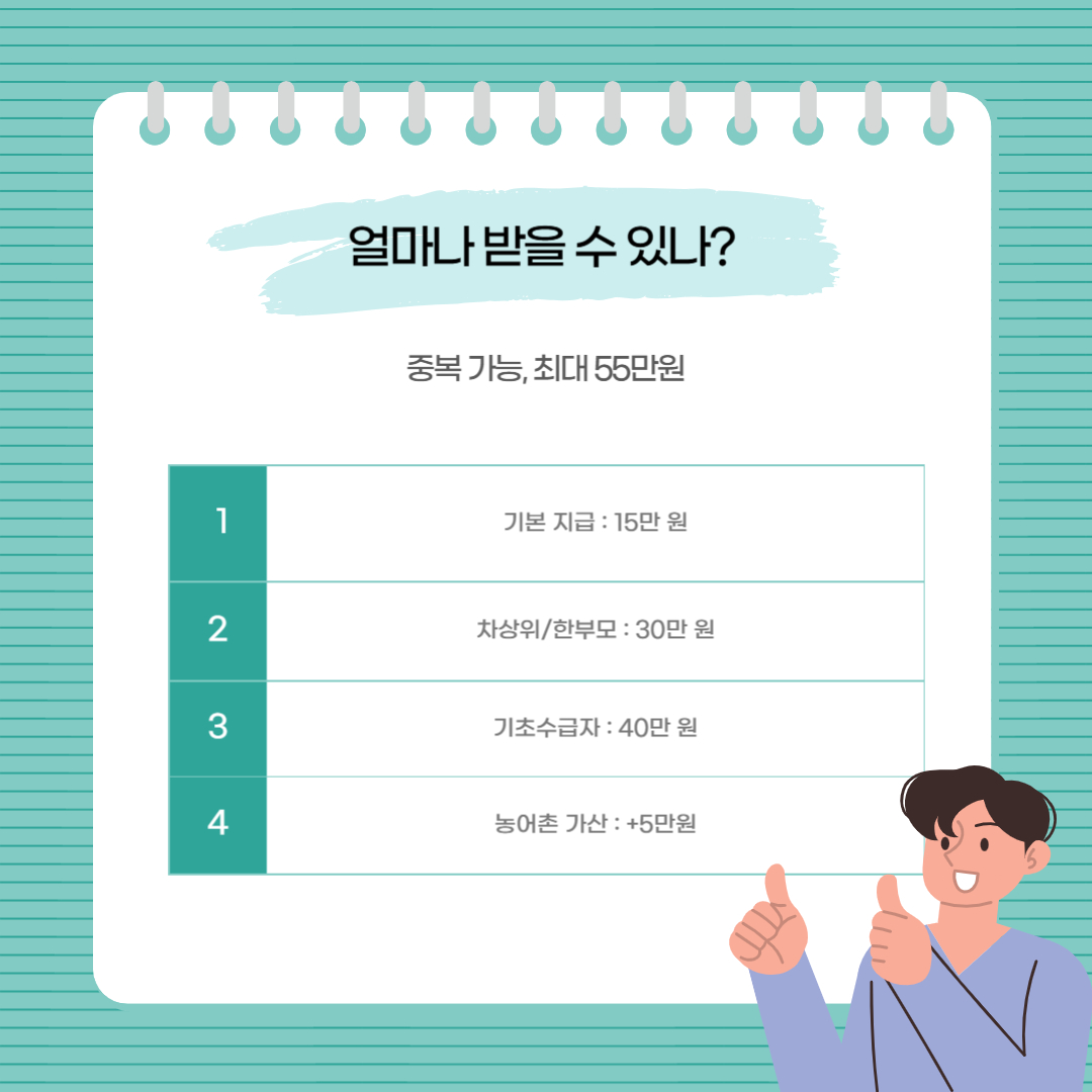지원금은 기본 15만 원부터 시작하며, 기초생활수급자 및 차상위 계층, 농어촌 가산 대상자는 최대 55만 원까지 받을 수 있다.