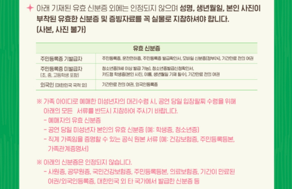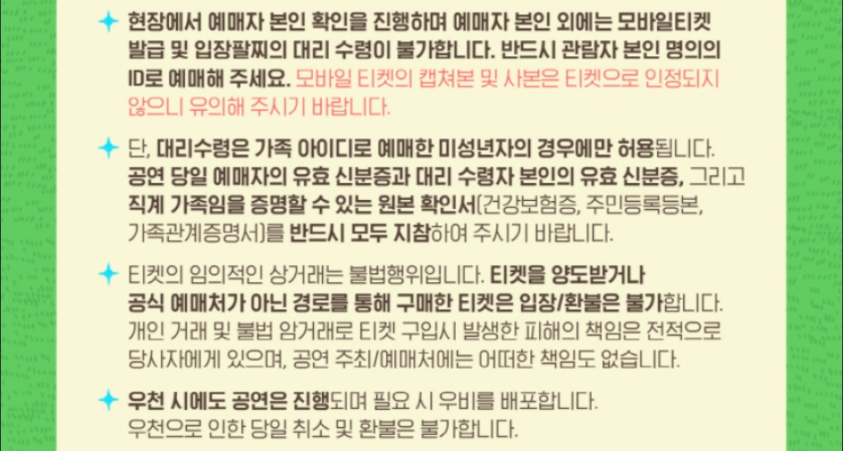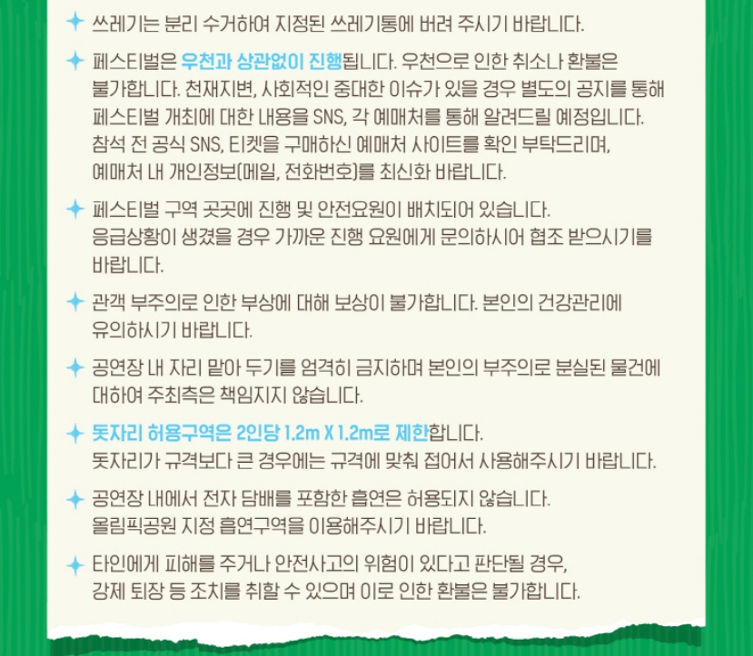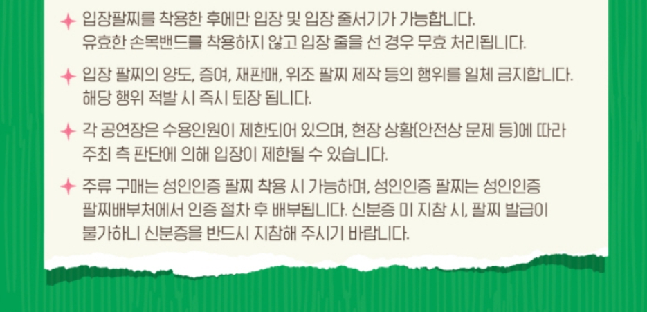 - 입장팔찌: 현장에서 반드시 착용해야 하며, 분실 시 재발급이 불가합니다.