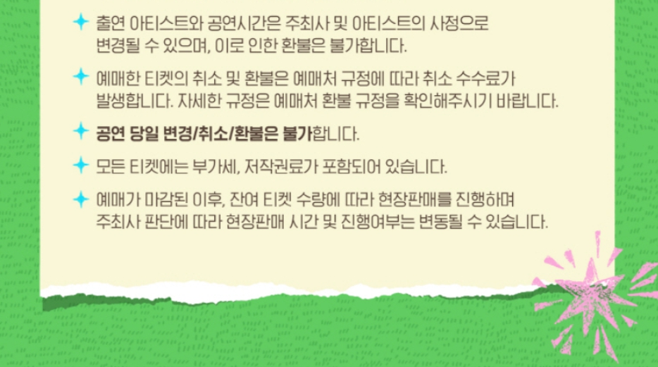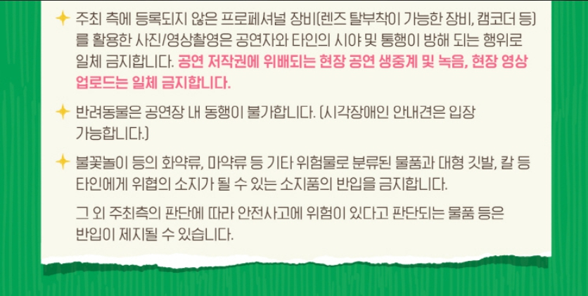 또한, 공연장 공식 SNS와 예매처의 공지사항을 수시로 확인하며 안전하게 축제를 즐기시길 권장합니다.