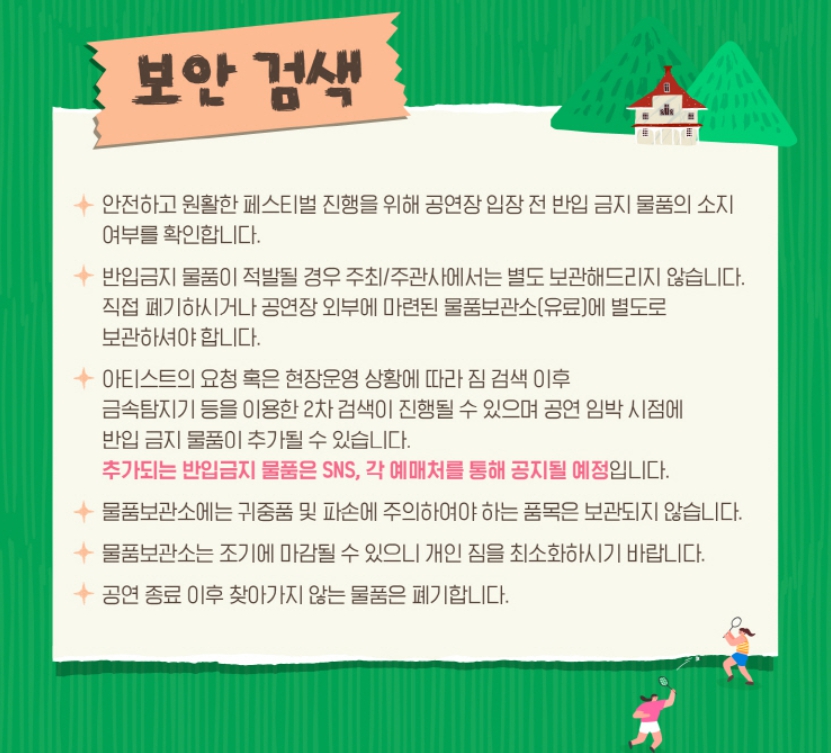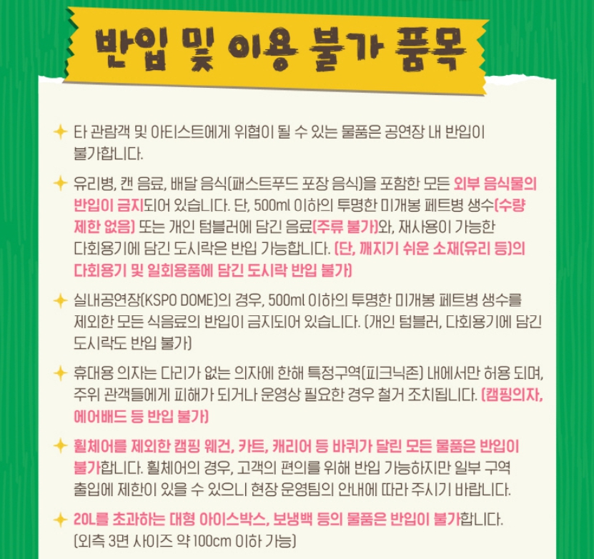 - 반입 금지 물품: 병, 캔, 대형 가방, 위험 물품 등
