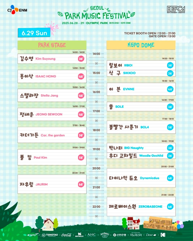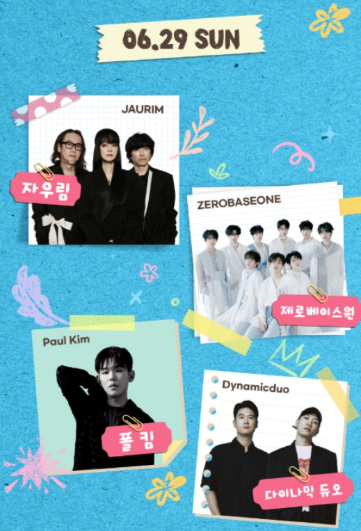 - 6월 29일 (일): 자우림, 폴킴, 제로베이스원, 다이나믹듀오, 볼빨간 사춘기 등이 풍성한 무대를 이어갑니다.