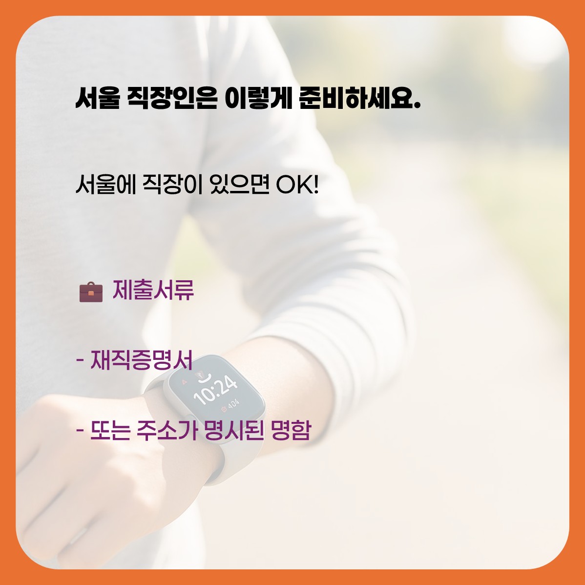 | 서울 직장인 | O | 재직증명서 또는 명함 | 사업장 주소 명시 |